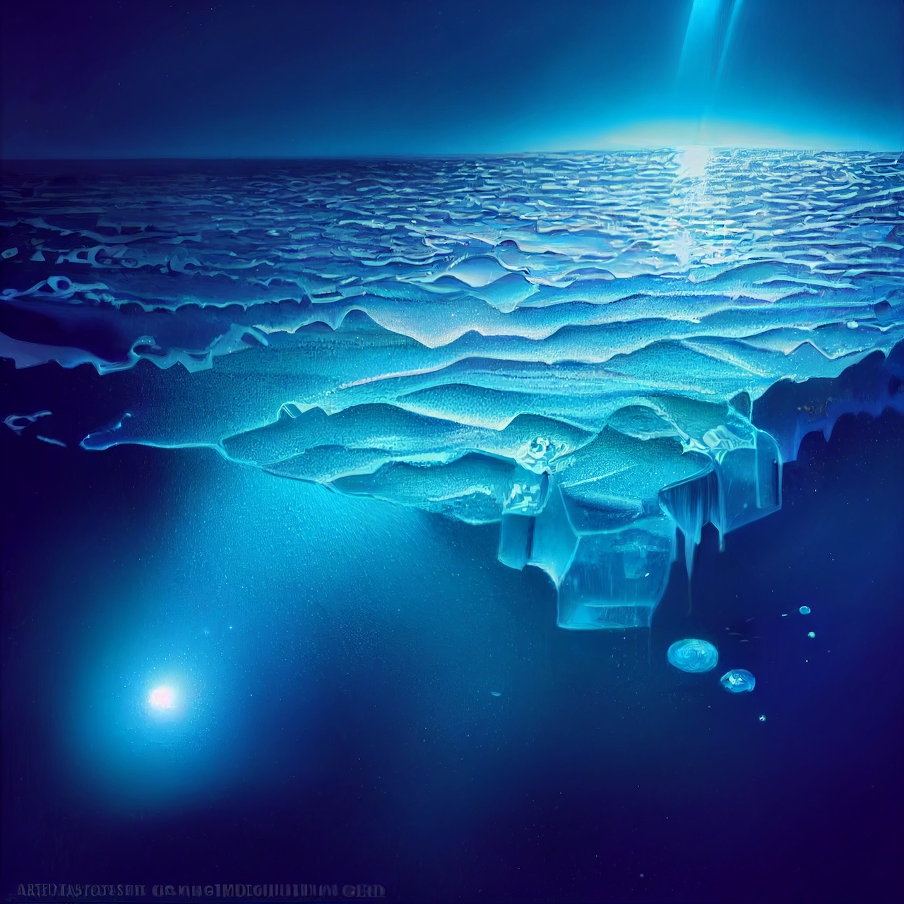 The title Underwater Comet is from a vision which I saw in my dream, a still gleaming azure comet underneath my foot on the frozen surface of the sea, which can be interpreted in the same way that Jung analyzed in his book, “The Psychology of the Transference” (Die Psychologie der Uebertragung, 1946): “The sea has closed over the king and queen, and they have gone back to the chaotic beginnings, the massa confusa. Physis has wrapped the man of light in a passionate embrace.”